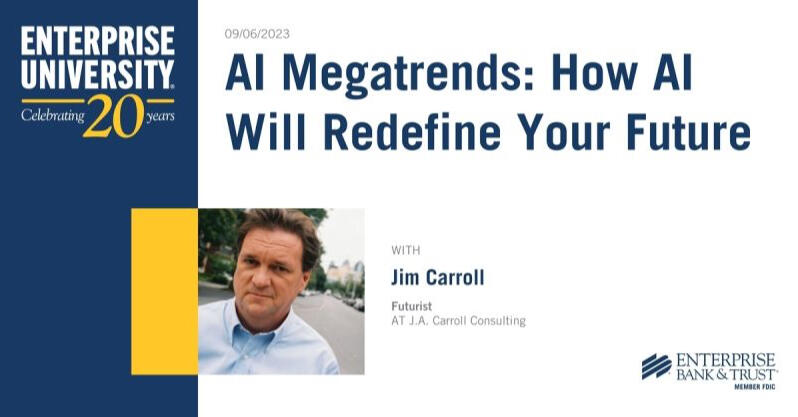 Enterprise Bank, based in the Western US, has been running its virtual Enterprise University for 20 years! To kick off its 2023 series, it brought in Jim for a keynote that looked at the impact and opportunity of AI in a vast number of different industries, from retail to manufacturing, insurance, and finance, to healthcare and architecture.