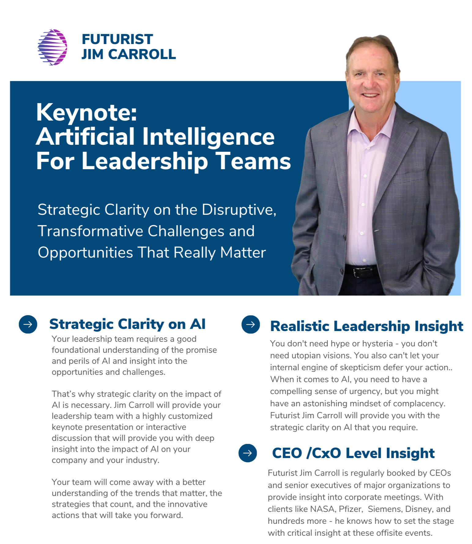 For over 30 years, when facing massive technological disruption, CEOs and senior executives at organizations likeNASA, Disney, The World Bank, and Mercedes Benz have turned to Jim Carroll. They don't seek technical jargon; they seek strategic clarity to navigate the path from a disruptive threat to a competitive advantage.Today, Jim is focusing that experience on the single biggest leadership challenge of our time:The Great AI ROI Reckoning. He guides organizations out of "pilot purgatory" and away from panicked, FOMO-driven spending , providing a clear roadmap to bridge the chasm between massive AI investments and measurable business returns.Jim's work is grounded in one core belief: succeeding with AI is not about understanding the technology in-depth—it's about implementing it with strategic insight. He provides the actionable frameworks that empower leaders to turn their AI enthusiasm into real enterprise reinvention and lasting growth.