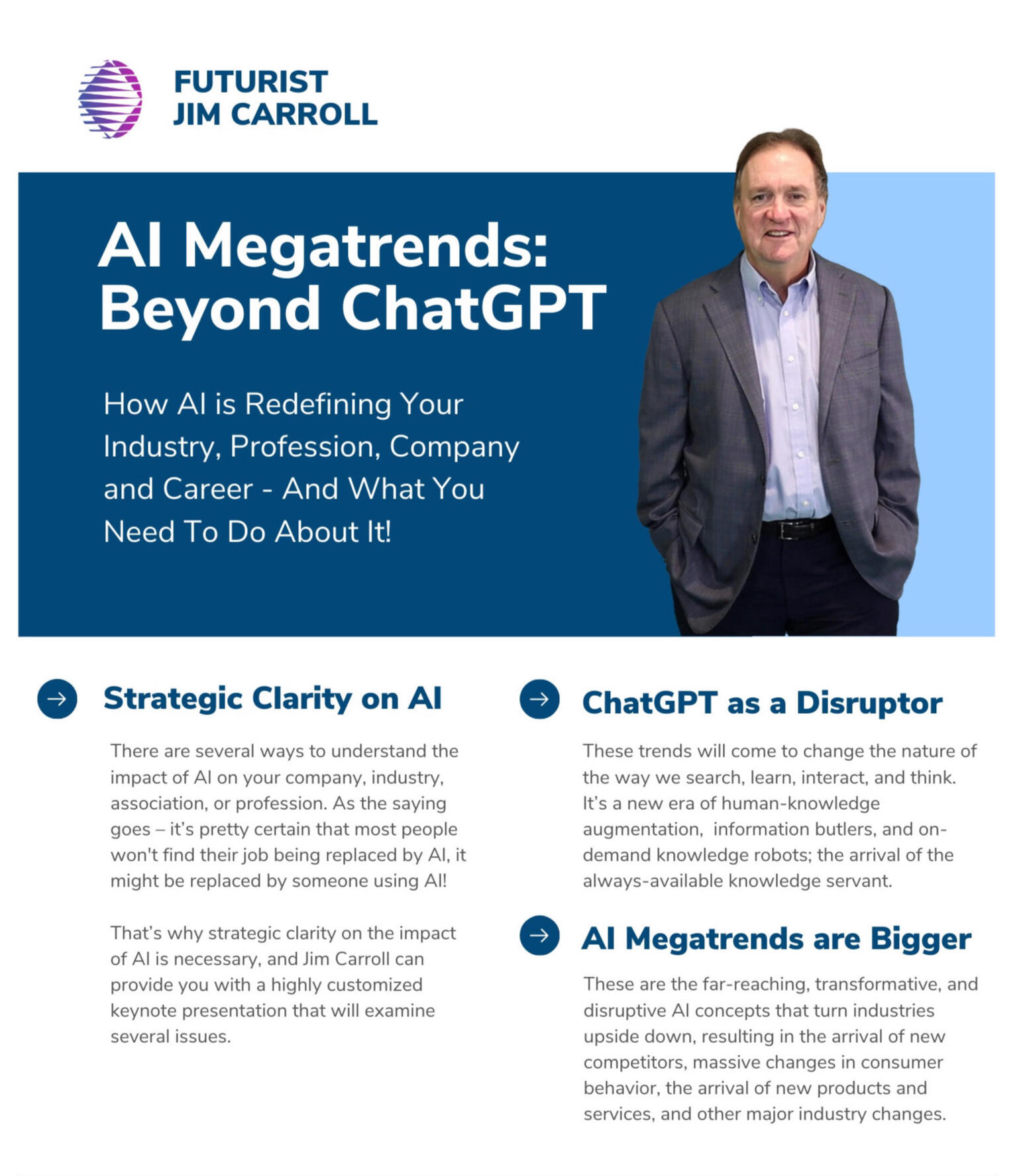 Have you noticed how suddenly, everyone is suddenly an AI expert? LOL!Most of those who share there insight are telling you what AI can do in broad, generic terms.Jim Carroll tells you what AI will do to your specific business model —and how to profit from it. Grounded in 30 years of forecasting trends and over a decade of specific AI analysis, Jim brings clarity to the chaos.